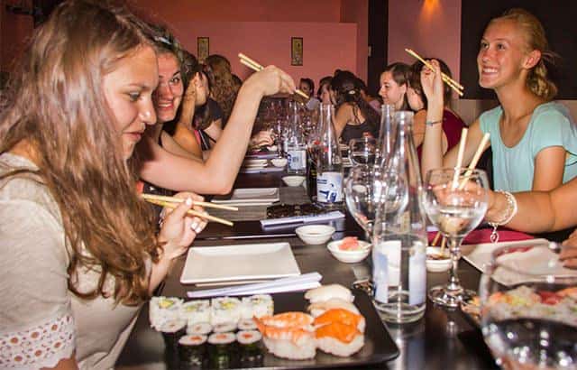 In the mornings, students will have breakfast before the morning classes. Breakfast will typically include coffee, tea, juice, eggs, pastries, fruit, sandwiches, and more. For lunch, students will typically have sandwiches, salad, pasta, tapas, sushi, pizza, burgers, seafood, meat, vegetables, or other foods. A typical dinner will usually include pasta, salad, steak, seafood, burger, chicken, sushi, ramen, vegetables, tikka masala, paella, and other delicious dishes.